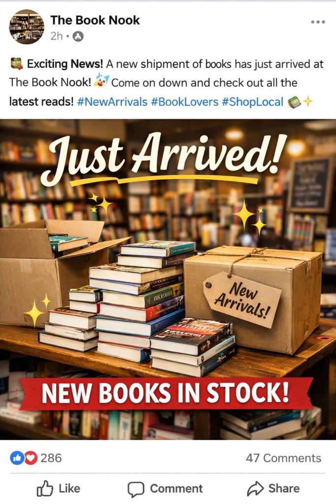 Summer owns a local bookstore and just got a new shipment of books to put on the shelves. If she hopes to sell these books, she will need to get the word out on her social media. Here is what that post might look like, with some hashtag suggestions she might use: