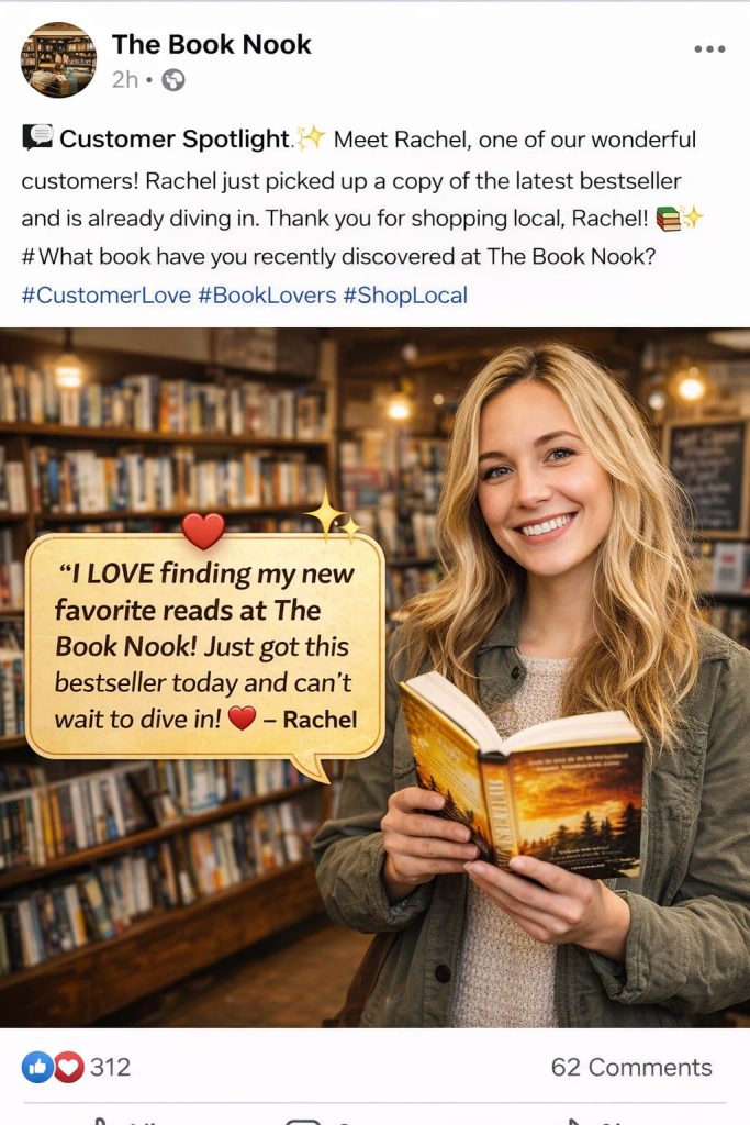 Social proof is a powerful way to drive website traffic with social media. In fact, 93% of consumers say online reviews influence their decisions. Allow space in your social media calendar for authentic reviews, and use them to encourage customers to learn more on your site. Here is an example of what a customer testimonial post might look like for Summer’s bookstore: