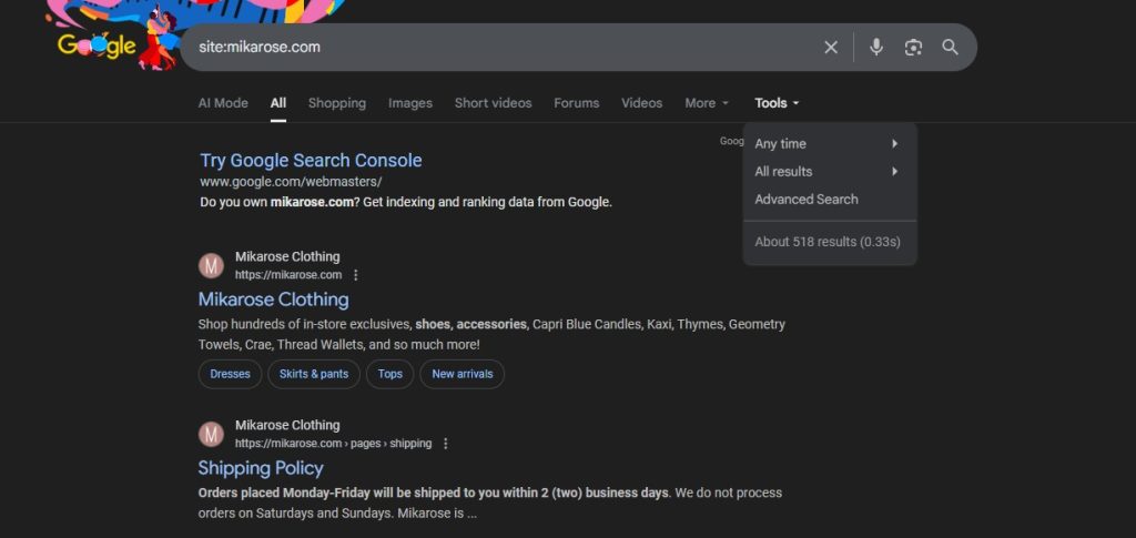 Mikarose clothing generates about 518 results for their website. Their crawlability is in good shape!